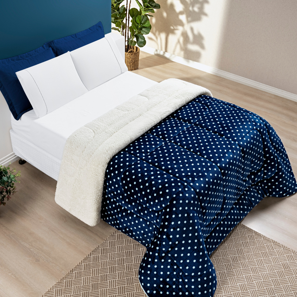 Coberdrom Queen Dupla Face Estampado de Sherpa Edredom Petit Poá - Marinho