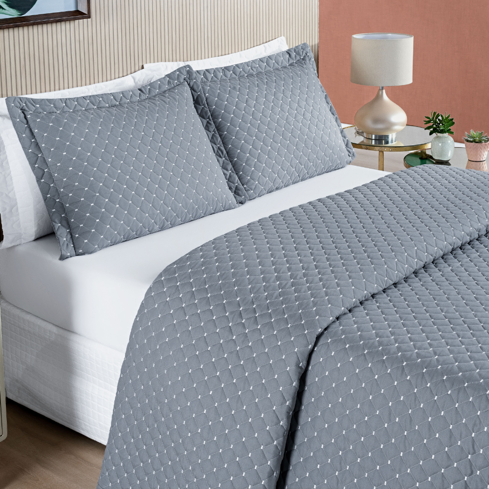 Cobre Leito Casal Padrão 03 Peças Dupla Face 200 Fios Bordado Ravena - Cinza
