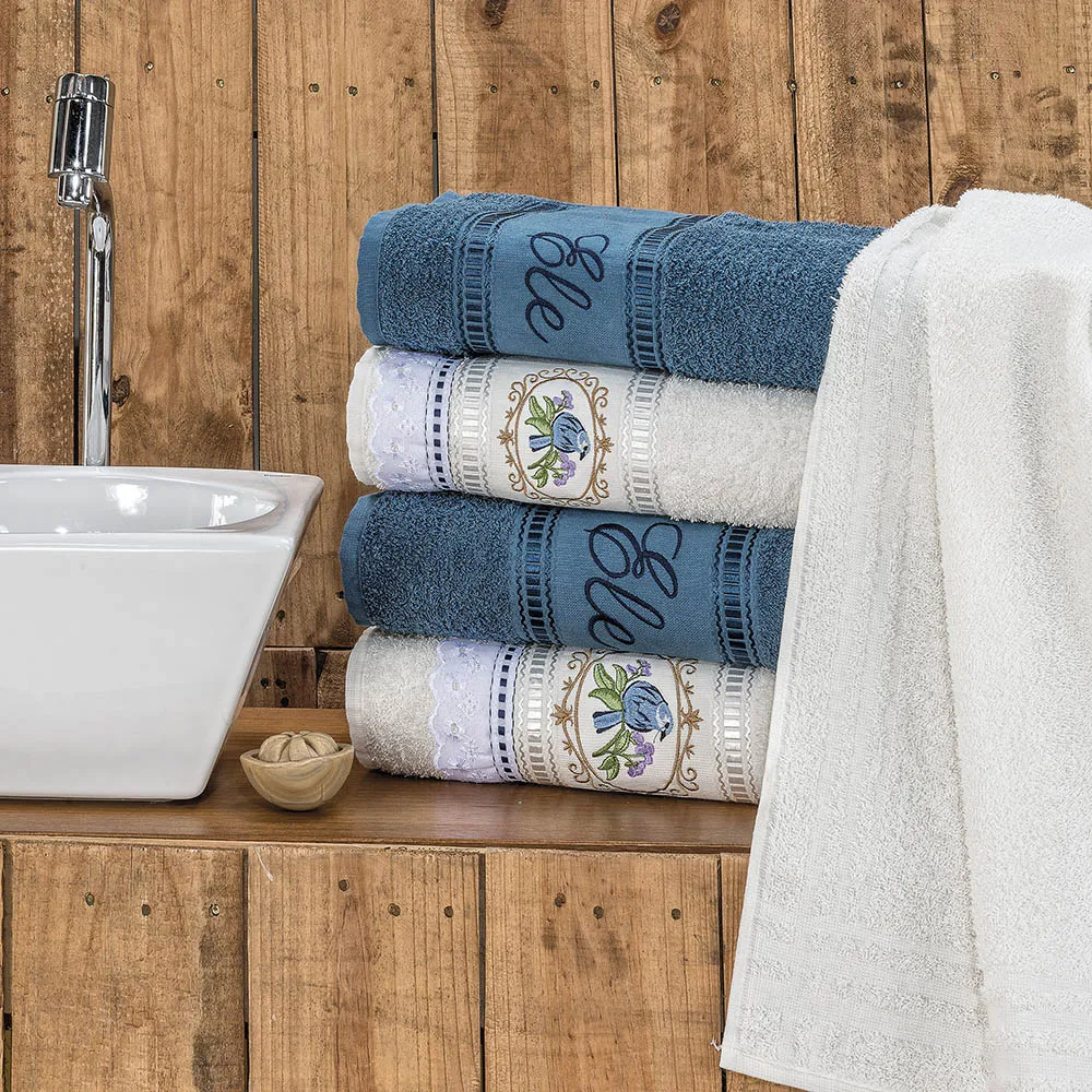Jogo de banho 05 Peças 100% Algodão bordada Ponto Russo - Azul/Palha