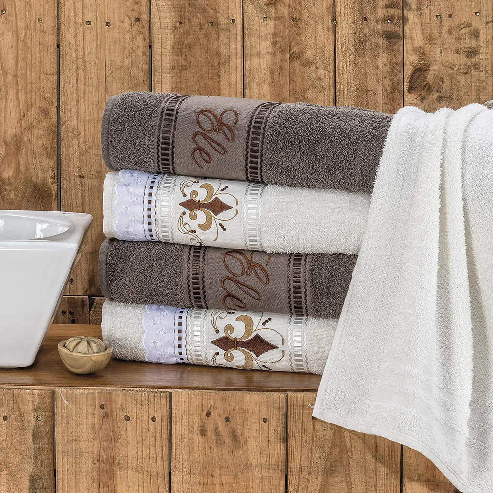 Composto por 5 peças, sendo 2 toalhas de banho, 2 toalhas de rosto e 1 toalha de piso, possui gravação Ele/Ela e barrado bordado. Confeccionado puramente em algodão, o conjunto é acolchoado e confortável, além de extremamente durável, resistente e de alta absorção. Transforme seu pós banho em um envolvente abraço de conforto.