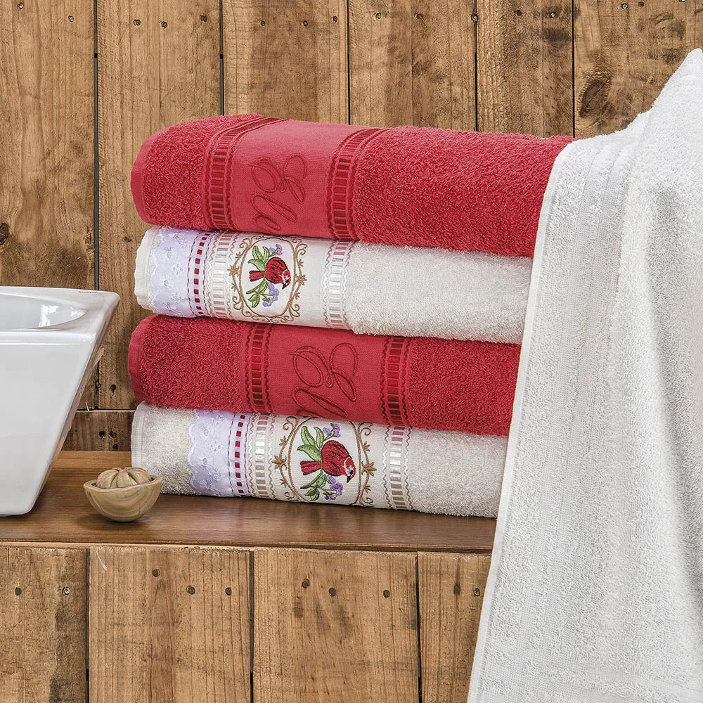 Jogo de banho 05 Peças 100% Algodão bordada Ponto Russo - Vermelho/Palha