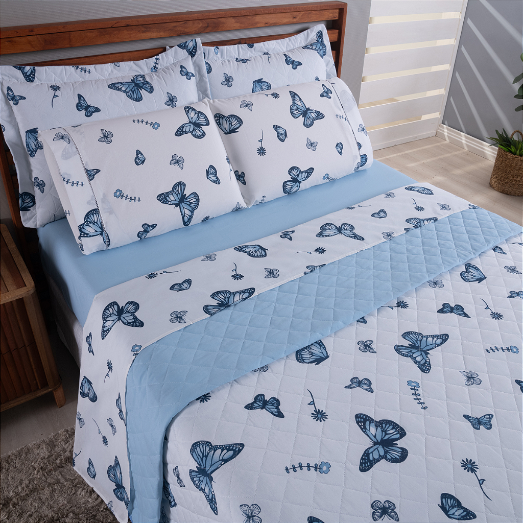 Kit 07 Peças Cobre leito + Jogo de lençol Casal 100% Algodão Percal 180 fios Vivale - Borboletas Azul