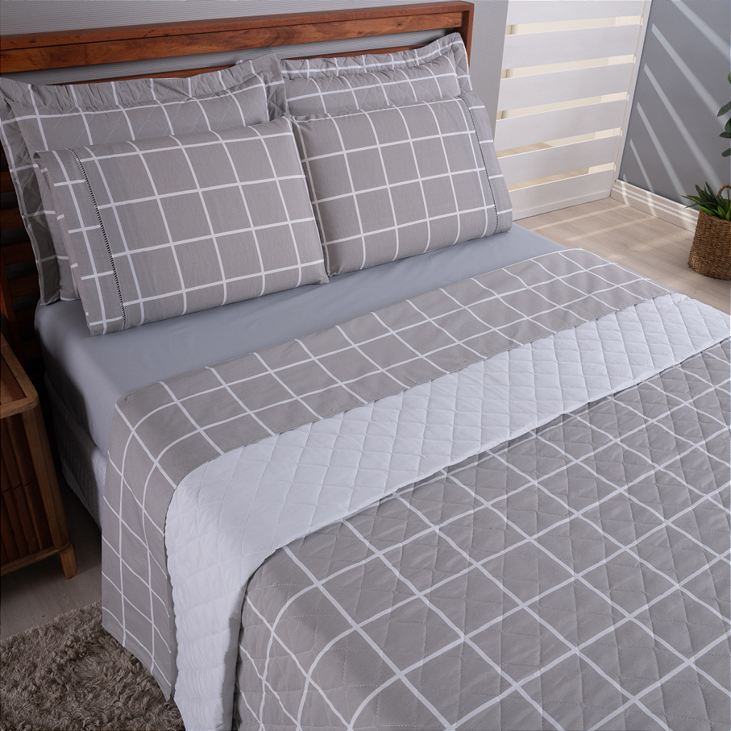 O Cobre Leito Dupla Face, com seus detalhes matelados e a opção da segunda face lisa, adiciona um toque de charme refinado, criando um ambiente acolhedor e elegante. Acompanha dois Portas Travesseiros com abas, que completam o visual, garantindo uma cama impecável e cheia de personalidade.